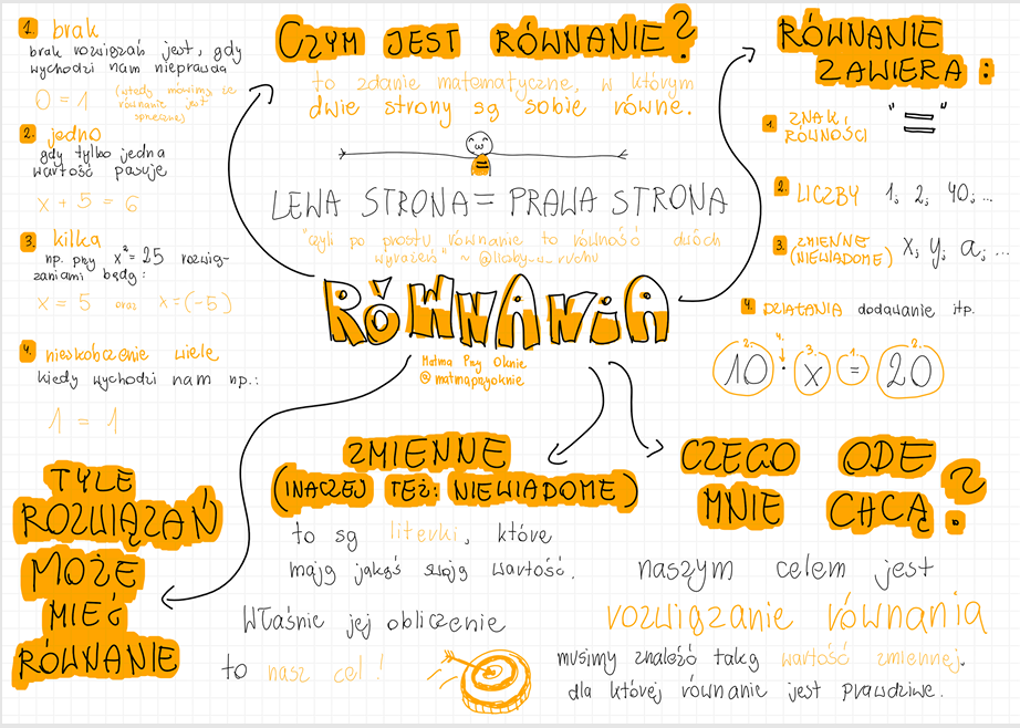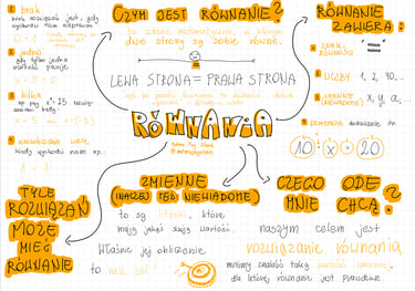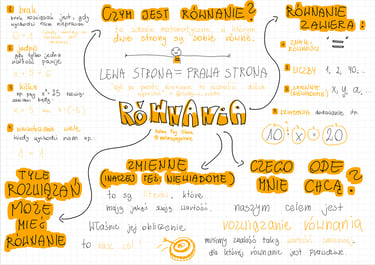Notatka graficzna w stylu mapy myśli, dotycząca równań.
